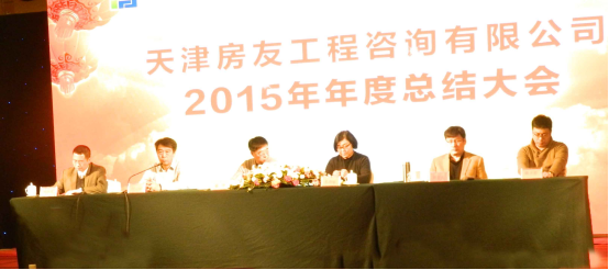 2015年年終總結(jié)大會(huì)由天津房友工程咨詢有限公司副總經(jīng)理田啟蒙主持,項(xiàng)目管理分公司(白海燕)、造價(jià)咨詢分公司(陳錦華)、招標(biāo)代理分公司(趙靜)、工程咨詢分公司(郭姍)、企業(yè)發(fā)展部(彭馮)做工作匯報(bào)。