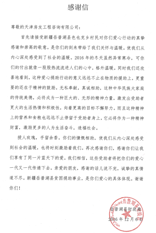 我們的善舉讓新疆岳普湖縣色也克鄉(xiāng)村民倍感溫馨,他(她)們委托當(dāng)?shù)乜h財(cái)政局也向我們發(fā)來了感謝信。