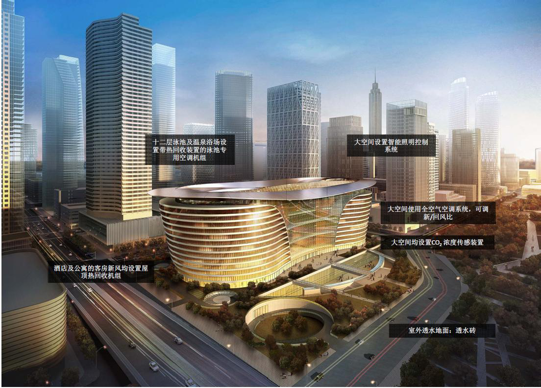 工程定位為綠色建造三星級(jí)標(biāo)準(zhǔn)、美國(guó)LEED認(rèn)證金獎(jiǎng)、綠色施工科技示范工程。施工中采用鋼板剪力墻框架結(jié)構(gòu)體系,大大減少了因結(jié)構(gòu)轉(zhuǎn)換造成的資源浪費(fèi)。形體自遮陽(yáng)的設(shè)計(jì)使得建筑可充分利用自然采光,同時(shí)又遮擋住了過多的太陽(yáng)輻射。智能照明控制系統(tǒng)、全空氣空調(diào)系統(tǒng),分層空調(diào)系統(tǒng)、可調(diào)新/回風(fēng)比等幾十種綠色施工創(chuàng)新技術(shù)的應(yīng)用,可謂名副其實(shí)的綠色建造。