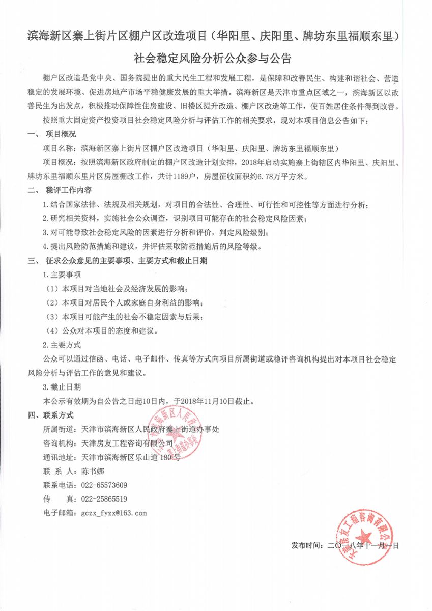 濱海新區(qū)塞上街片區(qū)棚戶區(qū)改造項(xiàng)目(華陽里、慶陽里、牌坊東里福順東里)社會(huì)穩(wěn)定風(fēng)險(xiǎn)分析公眾參與公告