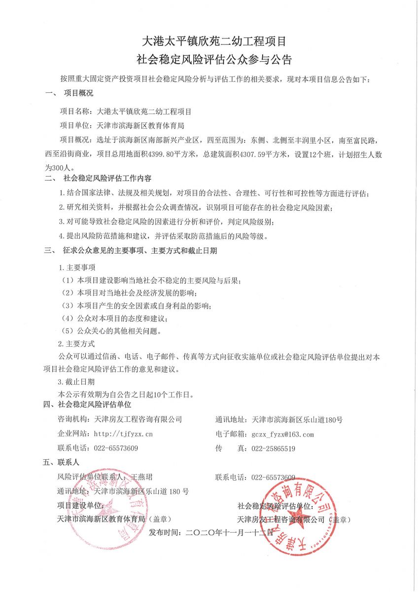 大港太平鎮(zhèn)欣苑二幼工程項(xiàng)目社會穩(wěn)定風(fēng)險(xiǎn)評估公眾參與公告