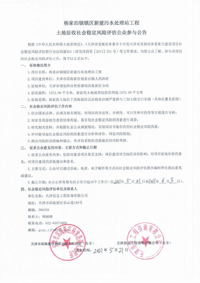 楊家泊鎮(zhèn)鎮(zhèn)區(qū)新建污水處理站工程土地征收社會穩(wěn)定風險評估公眾參與公告