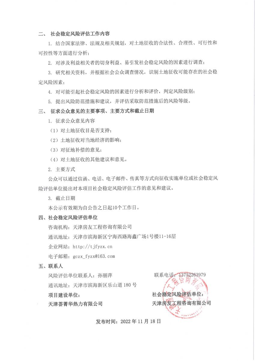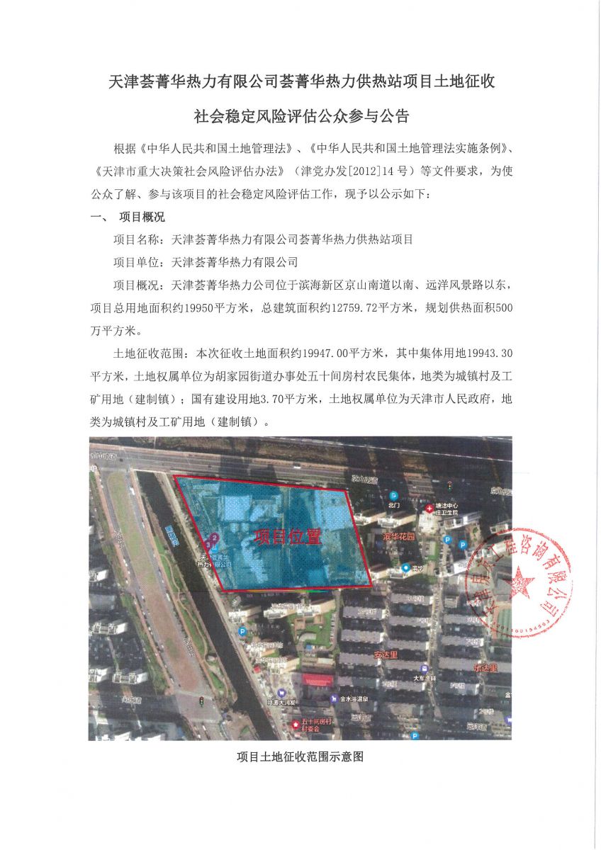 天津薈菁華熱力有限公司薈菁華熱力供熱站項目土地征收社會穩(wěn)定風險評估公眾參與公告