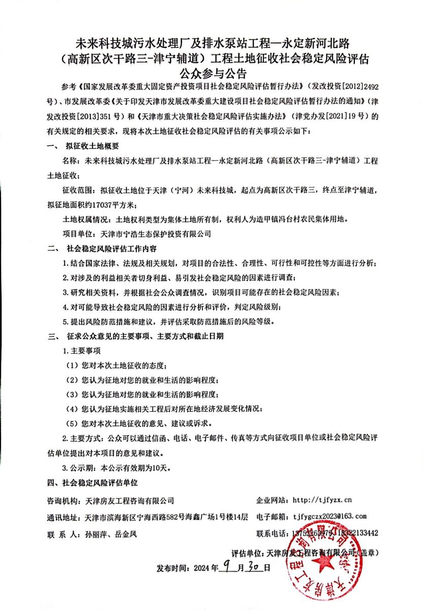 未來科技城污水處理廠及排水泵站工程—永定新河北路(高新區(qū)次干路三-津?qū)庉o道)工程土地征收社會穩(wěn)定風險評估公眾參與公告