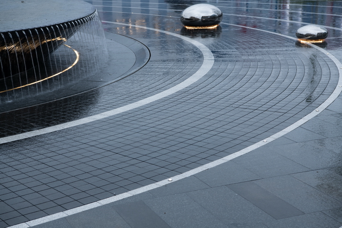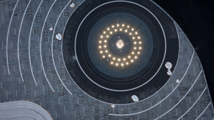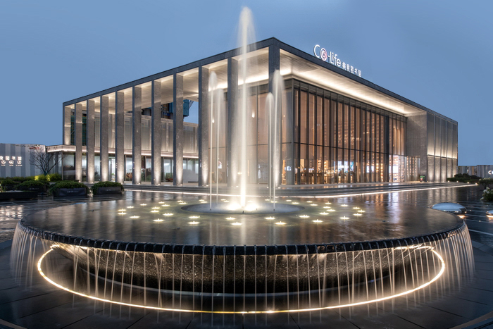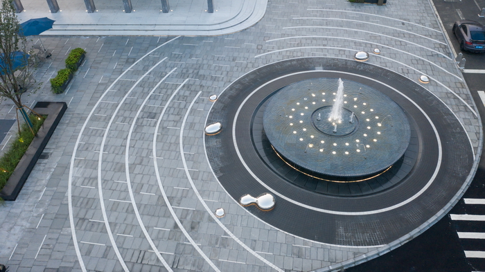 水盤周圈石材的特色處理形成珍珠一般垂落的串串水線,夜晚在地埋環(huán)形燈帶的映襯下,更如皇冠般熠熠生輝。