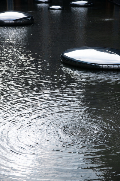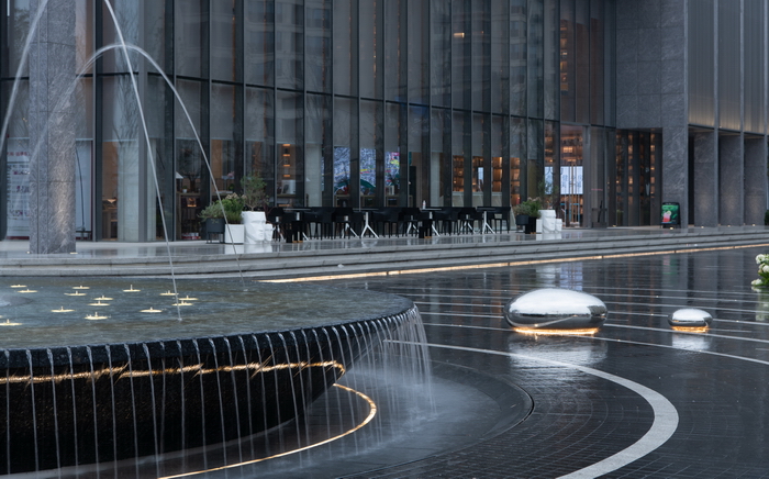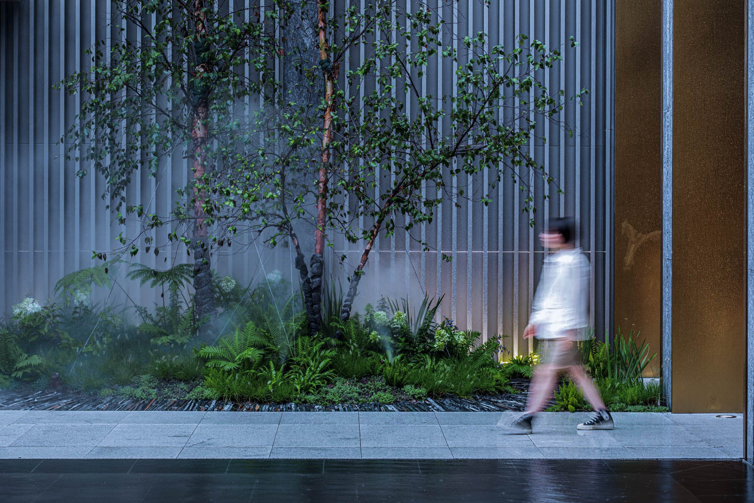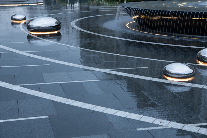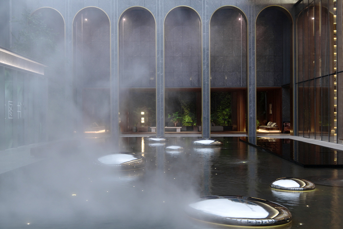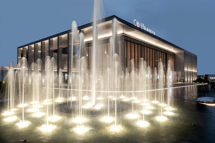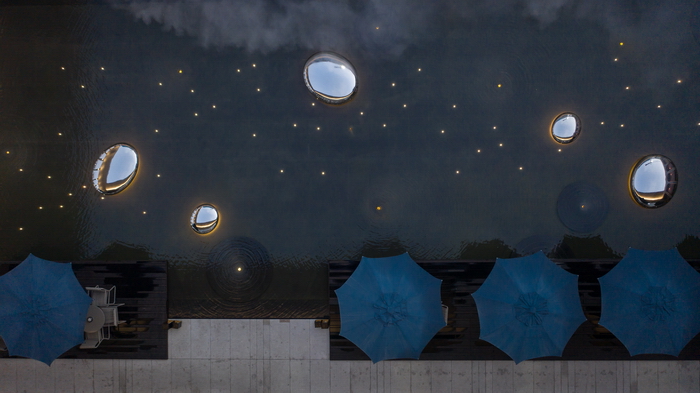建筑倒映在鏡面水上,輝煌璀璨;星光點點的水池中貼合水面的不銹鋼水滴雕塑群忽明忽暗,如同呼吸的節(jié)奏;霧森如夢似幻;漣漪涌泉帶著慢慢蕩開的哲思靜靜地噴涌。