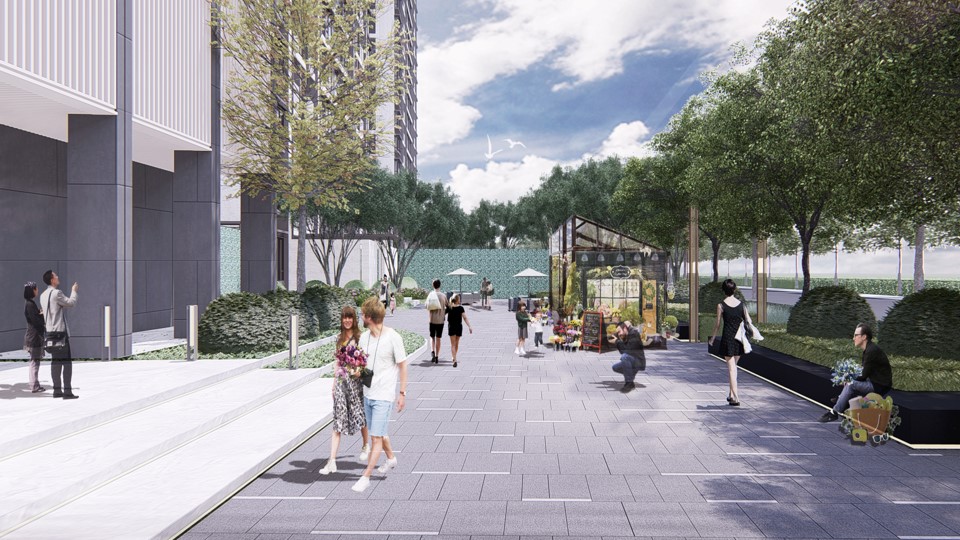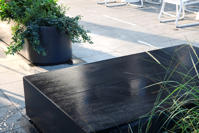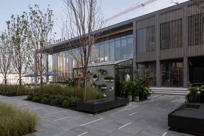 從 “引力口袋”外延的兩翼,黑色特色座墻結(jié)合種植池的做法作為一個重復元素形成同建筑節(jié)奏相匹配的序列感。