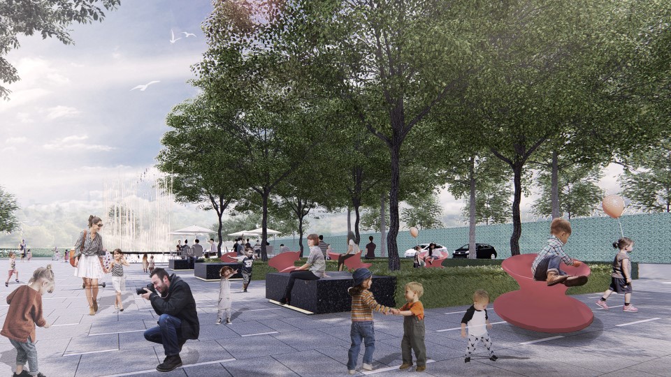 水盤周圈石材的特色處理形成珍珠一般垂落的串串水線,夜晚在地埋環(huán)形燈帶的映襯下,更如皇冠般熠熠生輝。水盤的設(shè)計也并非只能遠觀不可褻玩,小朋友和水盤的近身互動也是未來充滿活力和溫度的生活場景。