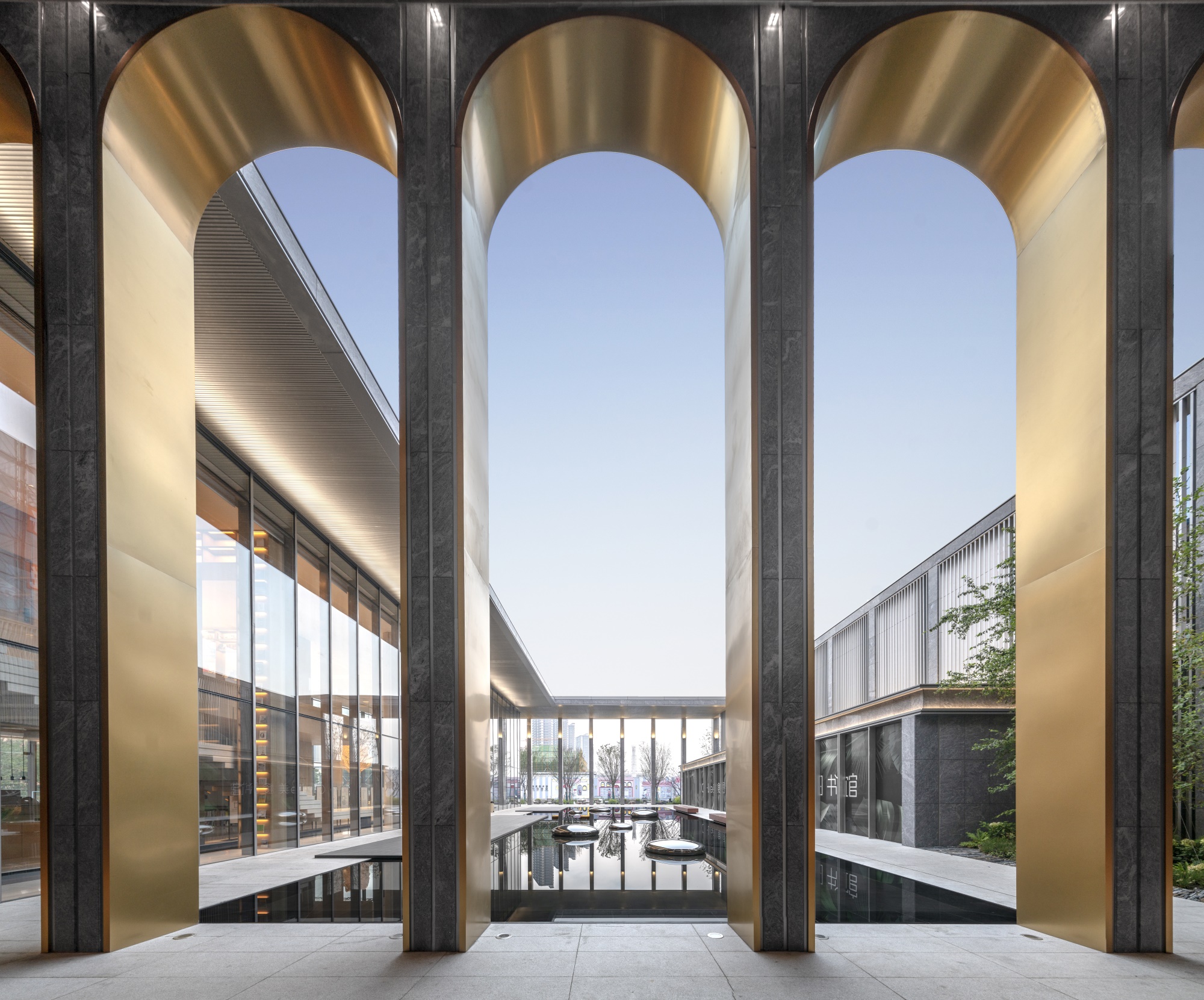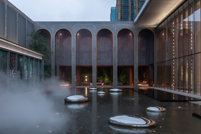 10米挑高的建筑柱廊圈出的內(nèi)庭空間 - “無界秘境”是整個示范區(qū)最具戲劇感的存在。周圈建筑立面顯著的豎線條形成強烈的韻律感。