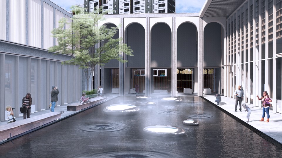 作為從下沙奧萊方向進入場地的主要到達點,我們以發(fā)散的同心圓承接住較為剛硬的建筑角部,疆界自然圓融地向外拓展,開放出一個如同打開雙臂呈迎接狀的“引力口袋”。以紐約林肯中心為設(shè)計靈感的直徑8.2米的互動引力噴泉水盤中,三種不同形態(tài)的噴泉交相輝映,形成熱烈歡快的迎賓氛圍,晶瑩璀璨的鏡面不銹鋼水滴藝術(shù)小品散落四周,營造藝術(shù)互動情趣。