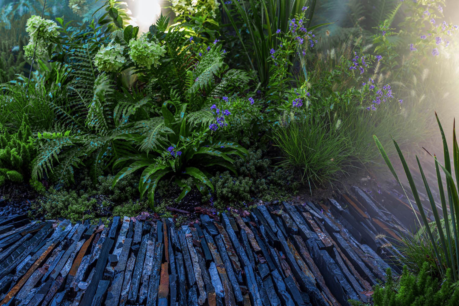 在內(nèi)庭無界秘境的主場景之外,我們還安排了兩處小確幸般的存在:一處是在水庭拐角一隅獨自美麗的以三兩株拼配河樺為主景的綠葉花境綠植區(qū);