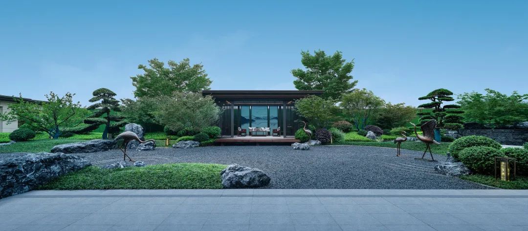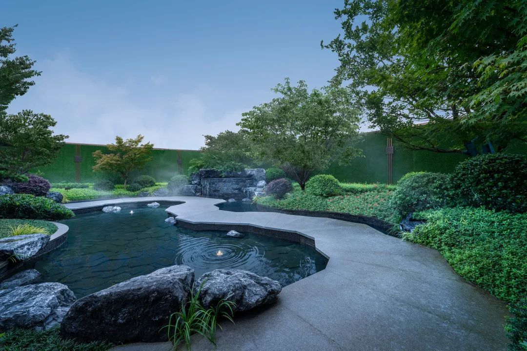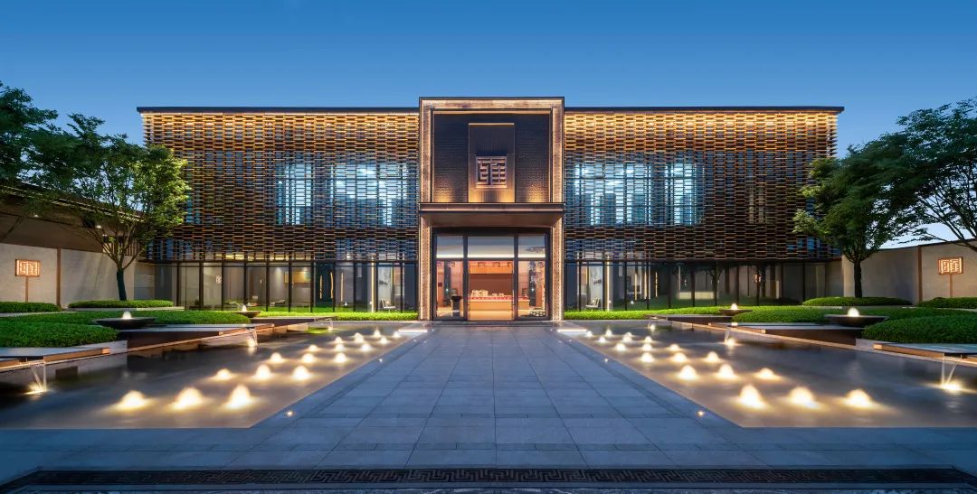 穿過售樓處建筑,豁然開朗,整個后場營造了一個極為簡潔純粹的空間,隨著晨昏的時間變化,交織的光影在景亭和水面上作畫,只為營造純粹的東方美學意境,整個庭院猶如一幅持續(xù)變化著的山水畫卷。