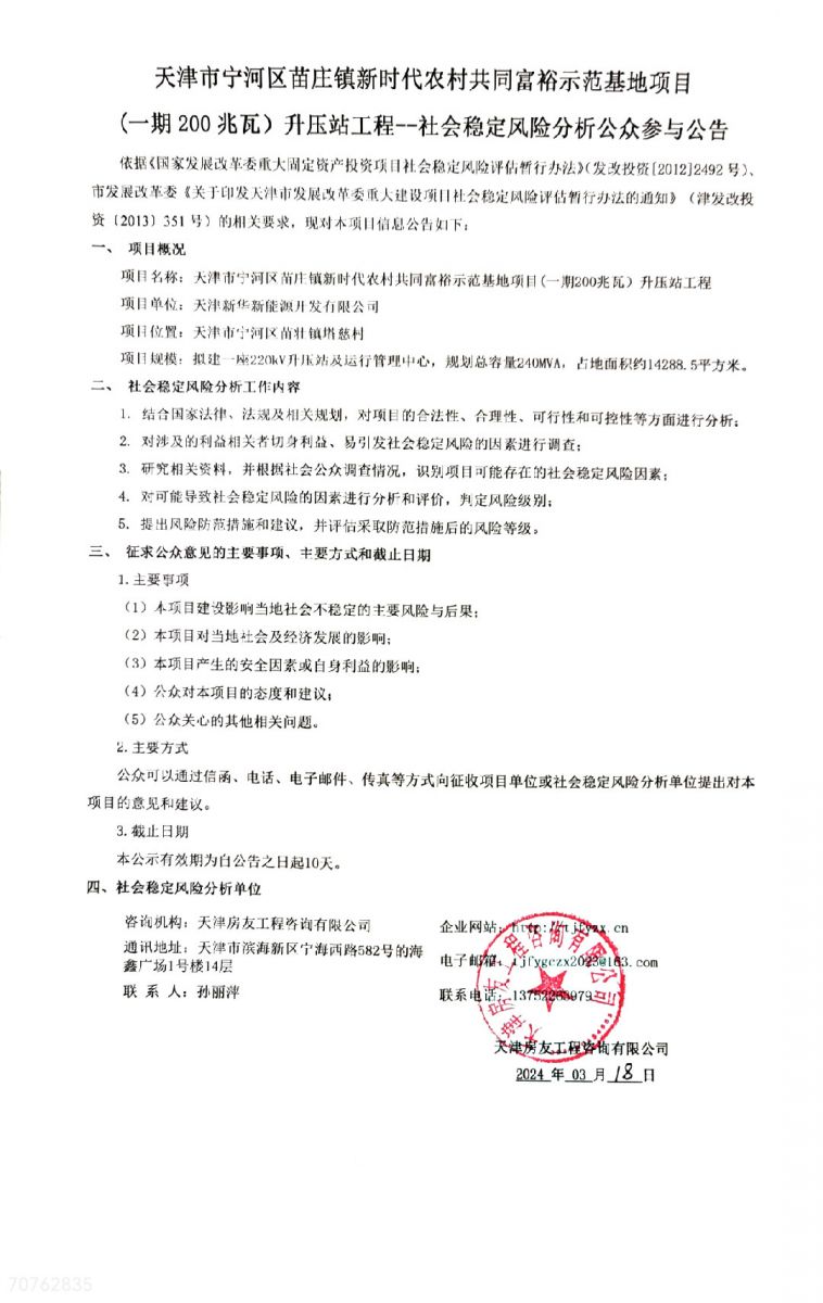 天津市寧河區(qū)苗莊鎮(zhèn)新時代農(nóng)村共同富裕示范基地項目(一期200兆瓦)升壓站工程--社會穩(wěn)定風險分析公眾參與公告