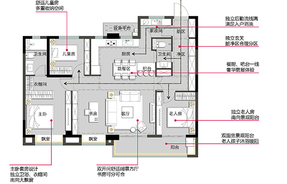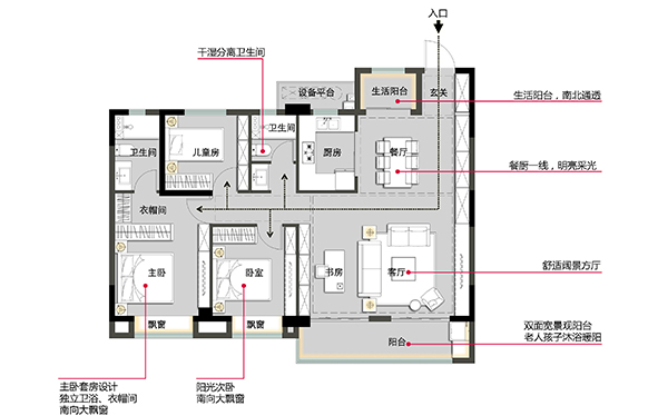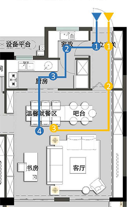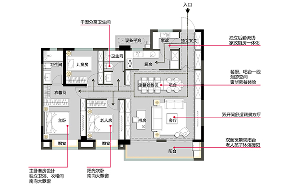 該洄游將入戶分為“家政動線”與“居家動線”?!凹艺泳€”:玄關(guān)-家政間-廚房-餐客廳 動線,當(dāng)買菜回家,或手上有重物回家時,先步入家政間處理,不必經(jīng)過客廳、餐廳,避免傳統(tǒng)戶型中,入戶動線不分離帶來的污漬、污染等情況。 “居家動線”:玄關(guān)-過廳-餐客廳等,讓家人或訪客直接通過玄關(guān)進(jìn)入客廳等空間,相較于傳統(tǒng)入戶動線,避免與家政動線的重合,保證生活的干凈與從容。