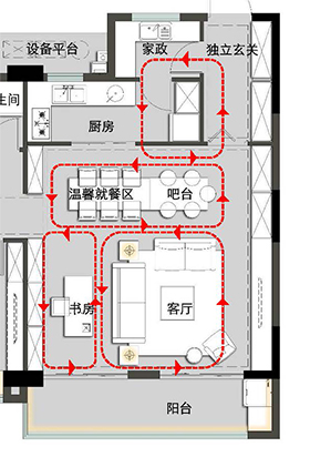 家庭核心交流區(qū)環(huán)形生活體驗(yàn)、多動線的洄游空間,代替線性生活體驗(yàn),使室內(nèi)距離無限延伸。