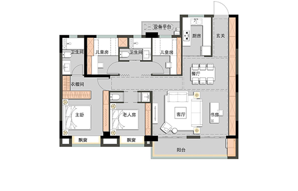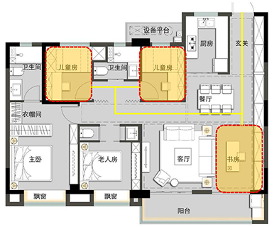 為孩子營造快樂天地,設(shè)置兩個獨(dú)立兒童套房。晚上,把推拉門一關(guān)就是兩個兒童套房、獨(dú)立天地,擁有專用的獨(dú)立衛(wèi)生間;白天打開推拉門,孩子可以在客廳與臥室穿梭。
