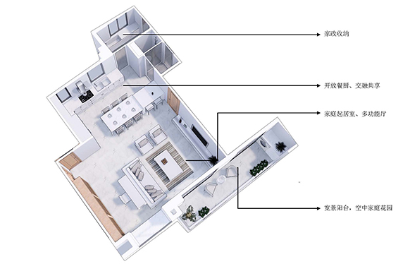 視覺放大、交融共享中體驗(yàn)到家庭的溫情;媽媽在忙碌于廚房時可以看到寶寶在玩耍,爸爸與爺爺在聊天,奶奶在空中花園中擺弄著......這個場景叫做“溫馨”。